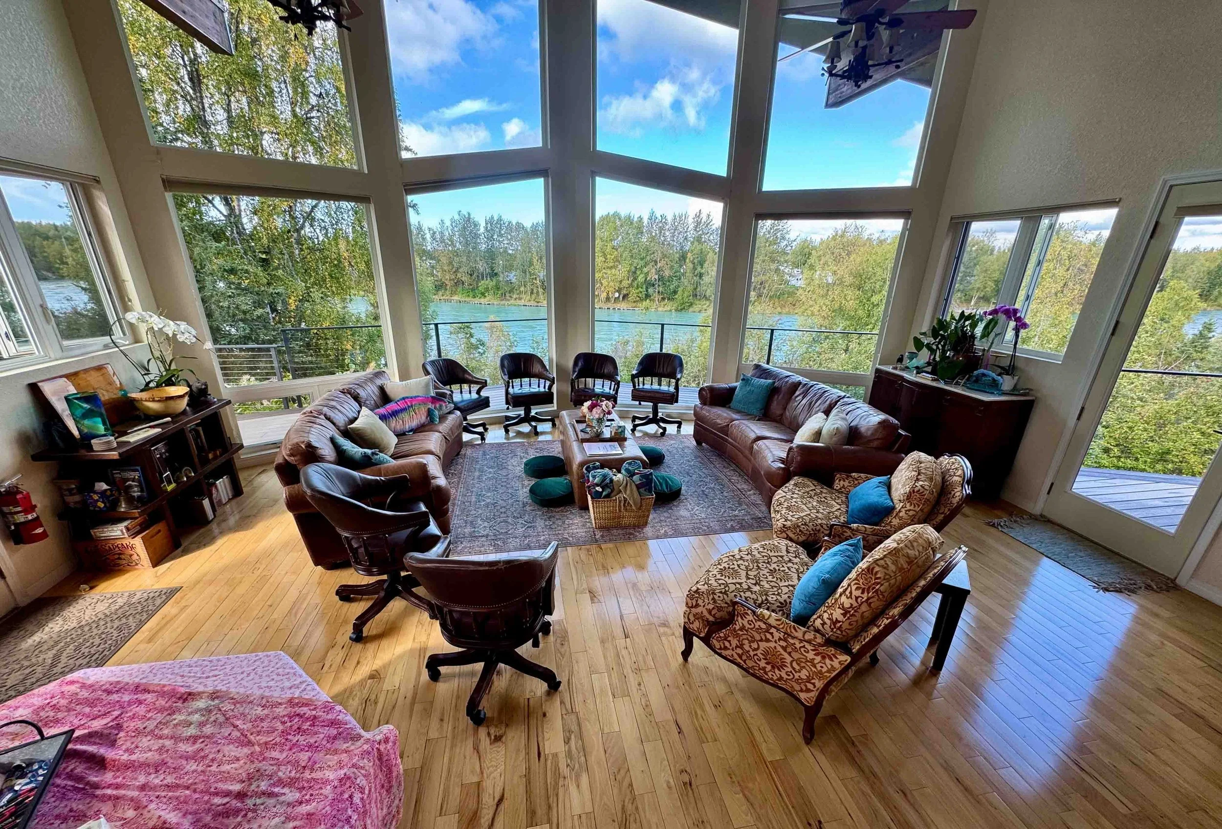 Floor-to-ceiling windows overlooking the aquamarine Kenai River. Fireplace. Gathering space for groups of 6 to 15. Natural light shifts with Alaska’s dramatic seasons.